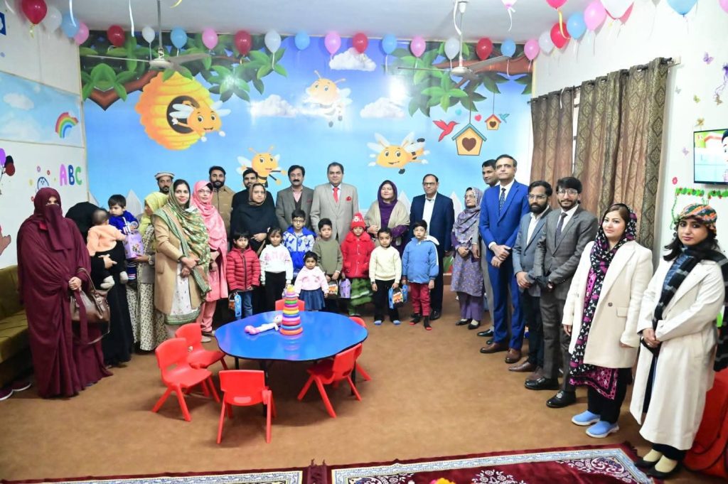 The honorable guests were warmly welcomed by the Principal, Prof. Dr. Shahida Sohail, along with , students and college staff. Children and students presented bouquet to the chief guest, followed by cake cutting at the Day Care Center, where the honorable guests also distributed gifts among the children, creating a joyful and memorable atmosphere.