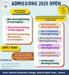 Govt Islamia Graduate College, Allama Iqbal Town, Lahore was established in 1966 as a private institution to impart commerce education up to intermediate level. It was upgraded to degree level (B.Com.) in 1970 when University of the Punjab granted affiliation to teach B.Com Classes.